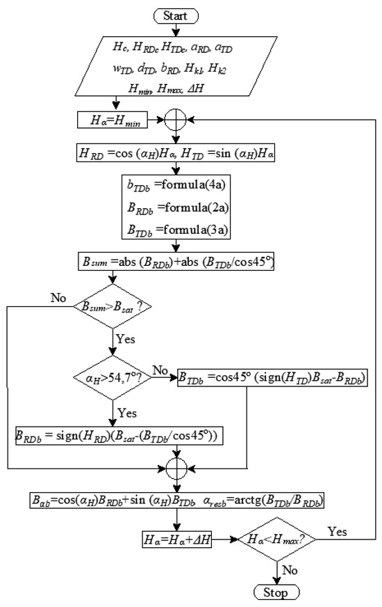 To determine the flux density of the limiting hysteresis loop, the measured coercive force Hc and the saturation flux density Bsat are introduced into the algorithm. The values of the parameters occurring in Equations (2a,b) and (3a,b) are also determined. For subsequent values of the field strength Hα, the field strength values along the RD and TD are determined, and then the flux densities BRDb and BTDb (or BRdu and BTdu if Hα decreases) are calculated. In the next step, the saturation condition (5a) or (5b) is checked. If the sum of BRDb and BTDb (or BrDu and BtDu) is greater than Bsat, the value of either the flux density along TD or RD is modified depending on the magnetization direction. At the final step, it is possible to determine the flux density Bα along the magnetization direction, the position of the resultant flux density vector, and its value, which is the geometric sum of the flux densities along the RD and TD.