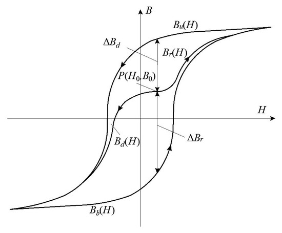 Determining the limiting hysteresis loops for a given magnetization direction makes it possible to calculate minor hysteresis loops (which are located inside limiting loop) for any changes in the field strength. As it was widely described in [28], the changes in the flux density Br(H) of any point P(H0, B0) (Figure 18) can be described as follows if the field strength H increases: