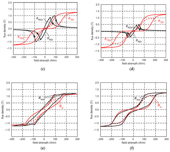 Limiting loops (continuous lines) and minor loops (dashed lines) for magnetization angles 30° (a,c,e) and 45° (b,d,f): (a,b) measured loops (black lines) and calculated loops (red lines) along magnetization direction, (c,d) estimated loops along rolling direction (black lines) and transverse direction (red lines), (e,f) loops of resultant flux density (black lines) and calculated loops (red lines); BRDr, BRDd—flux densities along RD for increasing and decreasing field strengths, respectively; BTDr, BTDd—flux densities along TD for increasing and decreasing field strengths, respectively; Bres—resultant flux density; Bα—flux density along magnetization direction.