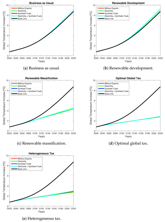 However, our work is also related to the second type of literature, which is the one that studies technological change. The first study in this context is [13] which introduces endogenous and directed technical change in an environmentally constrained growth model to argue that, when inputs are substitutable, sustainable growth can be achieved with temporary policies that redirect innovation towards clean inputs. Recently, refs. [14,15,16] added to the evidence of this phenomenon and showed the implications of certain technological developments. Specifically, ref. [17] studied the shale gas phenomenon and its long-term effects but without explicitly modeling the climate and carbon cycle. Therefore, we understand our work like a new technological innovation. Specifically, a new kind of energy (electricity or synthetic fuels from Latin America) for the world that explicitly models the climate and carbon cycle.