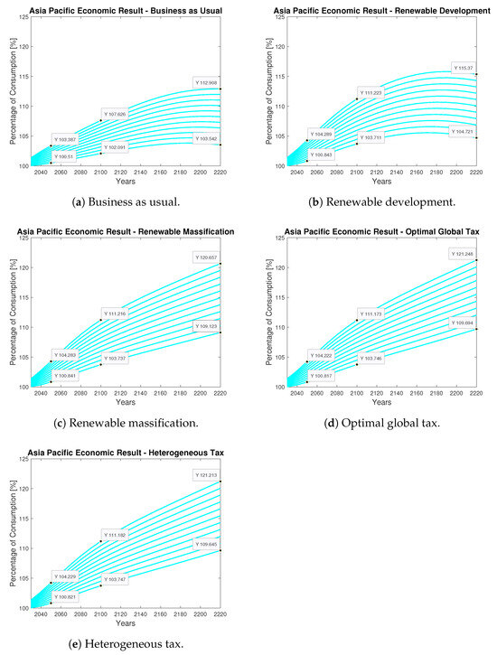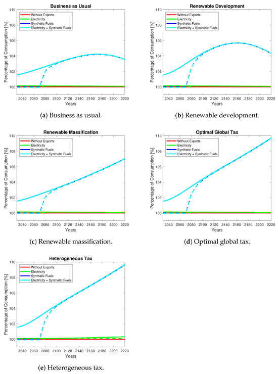 Economic results for Asia–Pacific: Percentage of consumption with respect to the base case without using the renewable potential. The broken lines correspond to the results when there is a 50-year delay in export development.