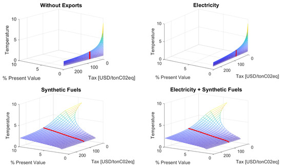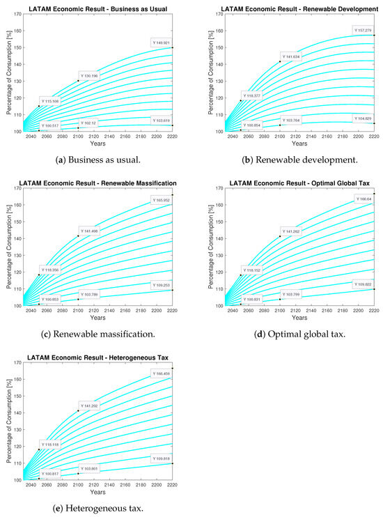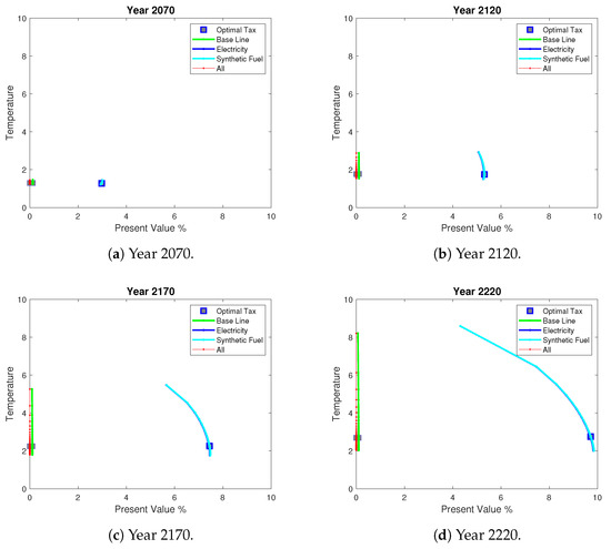 However, it may be difficult for less developed regions of the world to implement a high carbon tax. For example, in Latin America, Africa, or South Asia countries, only a few of them have emission taxes, and if they do, they do not exceed 10 (USD/ton) as shown in [47]. Therefore, the second scenario consists of a heterogeneous tax per region, which specifically corresponds to a tax equal to half of the optimum for less developed regions (LATAM, Africa, and South Asia), and an optimum tax for the other regions. Finally, the third possible scenario is the case in which no tax is applied worldwide.
