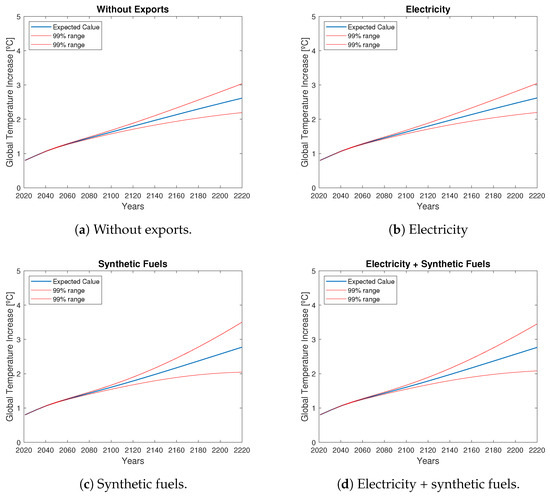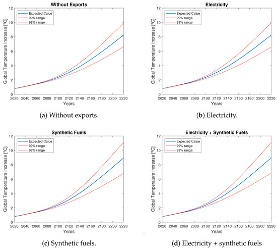 The main results of our analysis are as follows. First, renewable energy exports from LATAM generate economic benefits for all regions, but do not reduce the effects of global warming and, on the contrary, exacerbate the problem. Second, if the renewable energy exports are accompanied by policy measures that discourage the use of fossil fuel (e.g., carbon taxes), greater economic benefits can be obtained together with a reduction in global warming. This last result is independent of the allocation of the global demand for renewable energy exports between LATAM and Asia–Pacific regions. Third, the economic gains in LATAM could be as big as about five times the global average due to its exporting nature and the relatively low (per capita) income in comparison with most other regions. Fourth, due to the gradual capital accumulation process, delaying the development of exports reduces economic gains not only during the delay period, but also in the years following the commencement of exports. Finally, stochastic simulations suggest that uncertainties related to the renewable energy development are better attenuated when policy measures that discourage carbon emissions are deployed.