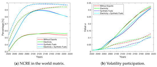 Economic results for North America: Percentage of consumption with respect to the base case without using the renewable potential. The broken lines correspond to the results when there is a 50-year delay in export development.