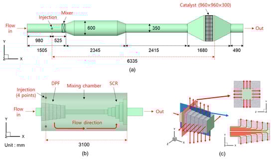 To compare the calculated results, the same SCR volume was considered for the analysis of the conventional model and all the cases in this study. Specifically, the performance of the proposed redesigned model was compared with that of the conventional model at an engine load of 75% [31]. As shown in Figure 1b, the SCR has a honeycomb structure with dimensions of 100 cpsi and 0.276 m3 (960 mm × 960 mm × 300 mm). The overall shape of the system differs between the conventional and redesigned models, but the equations, model constants, and boundary conditions applied to the turbulent flow, urea conversion reaction model, and DeNOx model are the same as those in the basic model. As shown in Figure 1b, the difference in system configuration compared to the conventional model is that the redesigned model is more compact so as to enable the consideration of both a DPF and SCR. The filter specifications of the DPF are identical to those of the SCR. As shown in Figure 1c, the DPF is installed behind the intake pipe. The exhaust gas flows through the intake pipe, passes through the DPF, and then flows up, down, left, and right. The exhaust gas exiting the DPF is mixed with the UWS sprayed at four locations and flowing onto the surface of the SCR along with the ammonia generated through a decomposition reaction. The DPF and SCR are installed inside the engine exhaust stream and mixing chamber. Unlike the x-axis flow in the existing model, the exhaust gas flows to the DPF inlet in four directions in the y–z plane: up, down, left, and right. The wall is located at the end of the DPF along the x-axis. Therefore, the exhaust gas does not pass through the x-axis but passes through the y–z plane. The mixing chamber can be either square or circular to suit the honeycomb DPF and SCR shapes. For UWS spraying, one specimen was applied to each corner of the square DPF.