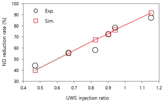 Comparison of the NO reduction rates between experiments and CFD simulations for the conventional model with different UWS injection ratios.