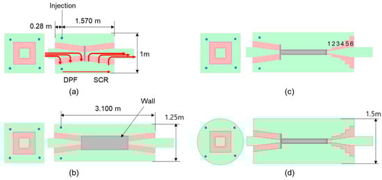 Figure 3 shows a vertical cross-sectional view of the analytical conditions used in this study. The shape information for the four analysis models (Cases 1–4) is listed in Table 1. The conventional model shown in Figure 1a is Case 0. Case 1, presented in Figure 3a, uses a square mixing chamber with a square DPF. There are four UWS injectors at the corner of the DPF, located 0.28 m away from the front of the mixing chamber. The distance between the injector position and end surface of the SCR is 1.57 m, and the height is 1 m, whereas in a conventional SCR system, the distance from the injection point to the catalyst is 6.33 m. The distance between the injection and catalyst in Case 1 is 1.57 m, approximately 75% shorter than that of the conventional system. The grey wall between the DPF and SCR prevents the exhaust gas that enters through the inlet from escaping to the outlet without passing through the DPF and SCR, as shown in Figure 3. To improve flow uniformity, the DPF and SCR have a six-step design with a thickness of 190 mm. Case 2 is shown in Figure 3b. The parameters for Case 2 are the same as those for Case 1, except for the length and height, which are 3.38 and 1.25 m, respectively. The distance from the injector to the catalyst is 3.1 m, constituting a 50% reduction compared with the conventional system. As the size increases, the central wall expands. Case 3 is the same as Case 2 except that the thickness of the SCR is different from that in Case 2, as shown in Figure 3c. Compared to Case 2, the catalysts in stages 1, 2, 3, and 4 are thinner, and those in stages 5 and 6 are thicker. In Case 4, the mixing area shape was changed from square to circular, and the height was increased by 1.5 m compared to that of Case 3, as shown in Figure 3d. The conditions for all cases are listed in Table 1.