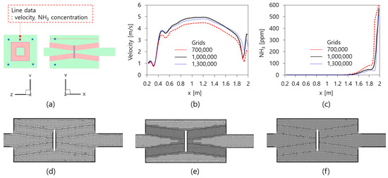 Because mesh independence is important in numerical studies, a mesh independence test for test cases for the three different grid configurations was performed for the velocity and NH3 concentration in Case 1, and the results are shown in Figure 4. The numbers of the grids in the three configurations were 700,000, 1,000,000, and 1,300,000. Figure 4a shows the locations where the line data for velocity and NH3 concentration were obtained. Figure 4b,c show the grid independence for the velocity and NH3 concentration, respectively. In the test case with 700,000 grids, the velocity distribution was lower than that of the test cases with 1,000,000 and 1,300,000 grids; conversely, the NH3 concentration was higher. For the test cases with 1,000,000 and 1,300,000 grids, similar values were observed for the velocity distribution and NH3 concentration. On this basis, a configuration of 1,000,000 grids was selected for Case 1 in this study. Figure 4d–f show mesh generation for the test cases of 700,000, 1,000,000, and 1,300,000 grids, respectively. Therefore, the 1,000,000 grids configuration was used in all four of the numerical models (Cases 1–4) examined in this study. The meshes for Cases 2–4 were generated similarly to the mesh applied to Case 1 and used 1,620,000, 1,800,000, and 1,810,000 grid configurations, respectively.