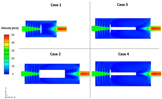 The velocity contours are presented in Figure 5. There are rapid-velocity points in the DPF because of the six-stage configuration. In all cases, high velocities were observed at each stage because the staged configuration increased the uniformity of the flow. However, there were high velocities at the rear of the SCR, indicating that the flow was concentrated there. This flow concentration may increase NH3 slip and filter damage [38]. The outlet velocity was faster than the inlet velocity in the contour; however, only the velocity of the center of the outlet was fast, and the velocity of the rest of the center section was slow. Thus, the flow rates at the inlet and outlet were identical. In Case 2, we expected that the residence time in the system would be significantly increased in the mixing chamber because the length is doubled and the height is longer than that of Case 1 by 0.25 m. As the residence time increases, the number of chemical reactions during urea evaporation and decomposition increases [45]. The residence time in Case 3 increased because the wall was smaller than that of Case 2. Moreover, the height of the mixing chamber in Case 4 was greater than that of Case 3 by 0.25 m, so the residence time increased. In Cases 3 and 4, the rear of the catalyst was thicker than that of Case 2 and thus decreased NH3 slip because of the concentration of the flow. Therefore, the velocity at the back of the catalyst in Cases 3 and 4 was lower than that of Cases 1 and 2. The average temperatures of the entire numerical domain in Cases 1–4 were 589, 588, 587, and 587 K, respectively. Conditions wherein the exhaust gas contains water and the temperature is over 520 K make it is easy for urea to decompose [30]. These temperature differences (1–2 K) did not significantly affect the thermal decomposition of urea and NO reduction reactions. However, the urea decomposition and NO reduction reactions change significantly when the inlet temperature is changed [46]. In this study, the inlet temperature of gases and adiabatic conditions in the wall were kept constant for Cases 1–4. Therefore, changing the numerical domains of urea decomposition and NO reduction reactions could be more effective than temperature at improving flow.