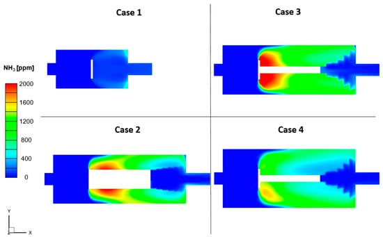 The NH3 contours are shown in Figure 6. In the NH3 contour of Case 1, the NH3 ppm value is the lowest because the chamber is shorter, resulting in a residence time that is insufficient to decompose urea [32]. In Case 2, the residence time increases because the size of the chamber increases and therefore the urea decomposition rate increases. In Case 3, urea decomposition increases because of the reduced wall size between the DPF and SCR. Therefore, the NH3 ppm value increased more than that of Case 2. In Case 4, the NH3 concentration was lower than that of Case 3 owing to the circular shape, which promoted flow uniformity. As the uniformity of the flow increased, the uniformity of the NH3 also increased. The volume of the chamber decreased when it had the same diameter as that of Case 3. Because Case 4 increased the height of the chamber by 0.25 m, the volume of Case 4 was greater than that of Case 3. This indicates that the urea decomposition rate increased in Case 4.