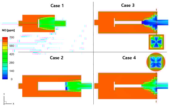 Figure 7 shows the NO distribution in the vertical section. Case 1 experiences a high NO concentration at the outlet owing to the low conversion rate of NH3 in the catalyst. In Case 2, the NH3 concentration increases and the NO concentration decreases at the outlet. As mentioned in relation to the velocity contour shown in Figure 5, the flow is concentrated at the rear of the SCR. Therefore, the NO reduction reaction in the SCR was enhanced by increasing the thickness of the catalyst in Case 3. Choi et al. [47] showed that the NO reduction rate increases with increasing flow uniformity. In Case 3, as shown in Figure 7, the NO reduction reactions in the SCR at the corner are reduced because the generated NH3 flows to the center of the mixing chamber. Therefore, the NO concentration at the corner is higher than that at the center. Because Case 4’s circular chamber design improves flow uniformity, the YZ plane contour has a lower concentration than that of Case 3 at the rear contour in the SCR.