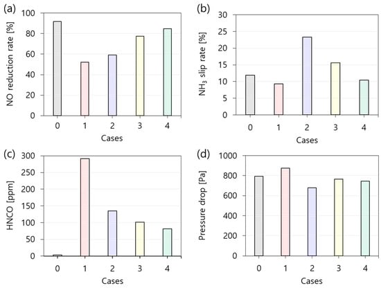 Comparison of the performance of the simulation cases (Cases 1–4) with that of the conventional system (Case 0): (a) NO reduction rate, (b) NH3 slip rate, (c) outlet HNCO ppm, and (d) pressure drop.