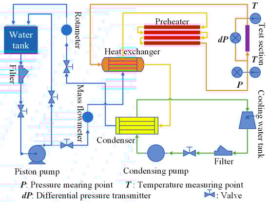 Figure 1 shows the main components of the experimental loop. The high-pressure piston pump provides the driving head for the whole loop, and a part of the deionized water is driven to return to the water storage tank through the filter, and its flow rate is controlled by the bypass valve. The other part of the water enters the main line, flows into the shell side of the heat exchanger through the mass flow meter, and carries out sufficient heat exchange with the high-temperature working medium flowing out of the experimental section in the tube side. The heated working medium enters the preheating section and is further heated to the given temperature, and then flows through the experimental section, the heat exchanger, and the condenser in turn. After being cooled to near room temperature, the water is measured by the flow meter and returned to the storage tank.