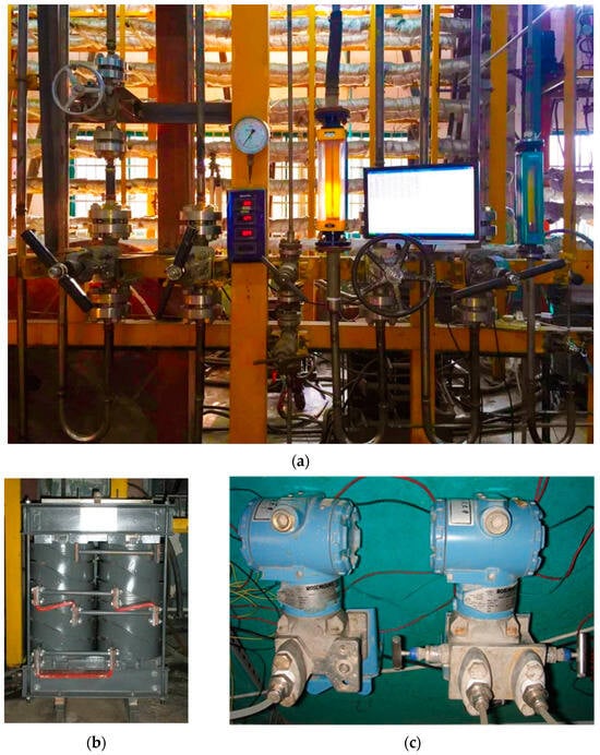 Photos of part of the equipment in the test loop. (a) Flow control system. (b) Transformer. (c) Pressure and pressure difference transmitter.
