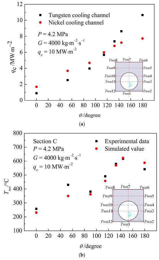 To simulate the unilateral radiation heating of the divertor target by high-temperature plasma, it is necessary to obtain a high circumferential non-uniform heat flux in the cooling channel. The traditional heating methods such as silicon carbon rods and particle guns have some shortcomings such as limited heating power and easy to be affected by the arrangement of thermocouples. In this experiment, a circumferential non-uniform heat flux was obtained by biasing the cooling channel to one side and electrically heating the whole test section. Numerical simulation results were obtained by ANSYS CFX16.0to select the material and bias size of the experimental section. In the early design of CFETR, the material of the cooling channel of the divertor target is tungsten. In Figure 3a, black points show the circumferential heat flux when the tungsten cooling channel is located in the center under unilateral radiation heating under p = 4.2 MPa, G = 4000 kg·m−2·s−1 and qe =10 MW·m−2, while red points show the circumferential heat flux of the pure nickel cooling channel by electrically heated under the same working condition. It can be seen that under the condition of unilateral radiation heating, the local heat flux at the top of the cooling section reaches 10.6 MW·m−2, while the local heat flux at the bottom is only 0.9 MW·m−2. In the case of one-side electric heating, the heat flux at the top of the cooling section is 7.7 MW·m−2, and the heat flux at the bottom is 1.7 MW·m−2. After comparing with the simulation results of other materials, it is found that when the material is pure nickel, the circumferential distribution of heat flux in the cooling channel is closest to the situation of unilateral radiation, so Ni6 is chosen to be the material of the test section. Before starting the formal test, in order to verify the rationality of the selected scheme, the measured circumferential outer wall temperature of the experimental section was compared with the numerical simulation results, as shown in Figure 3b. It can be seen that the highest temperature and the lowest temperature in the test values are close to the simulated values, respectively, and the circumferential distribution of the measured outer wall temperature has the same trend as the simulated results. Therefore, we consider that this test scheme is reasonable.