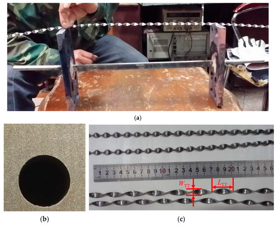 The photo of overall appearance of the experimental section is shown in Figure 4a. The two ends of the cuboid are inserted into the copper electrode and fixed by silver welding. The photos of the cross section and the twisted tapes (TT) are shown in Figure 4b,c, respectively. In the center of the circular channel, a TT with width WTT = 8 mm, thickness 0.3 mm, and distortion ratio y = 2 is built, and its material is 321 stainless steel. Where y is defined as the ratio of bond pitch LTT to WTT.