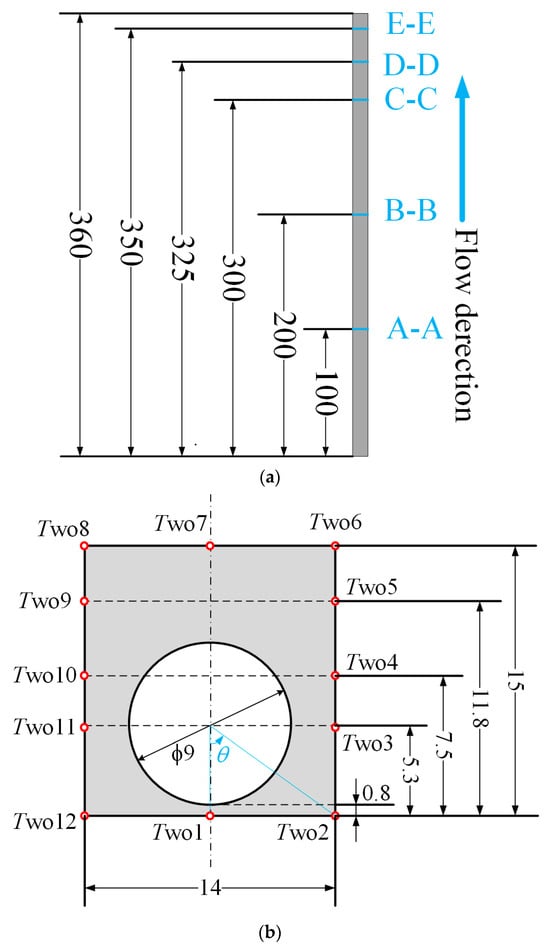 The experimental section size (mm) and thermocouples distribution. (a) The axial locations of the temperature measuring points on the outer wall. (b) The cross-section size and thermocouples distribution.