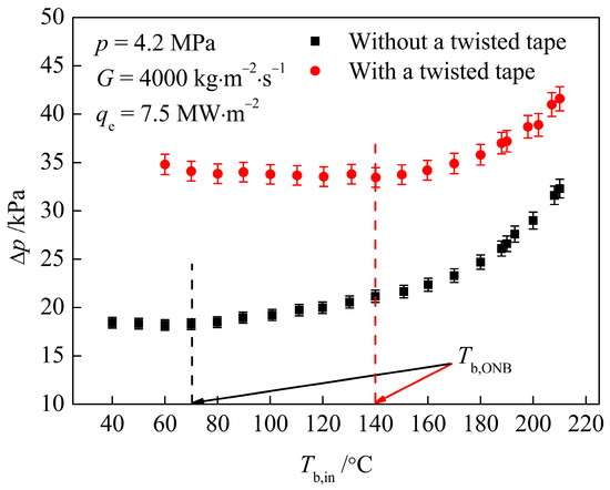 Figure 6 shows the comparison of pressure drop curves of the test section with and without a TT under qe = 7.5 MW·m−2, p = 4.2 MPa, and G = 4000 kg·m−2·s−1. It can be observed that with the increase in inlet bulk temperature Tb,in, both pressure drop curves show a trend of slightly decreasing at first and then gradually increasing, and the slope of rise also increases with the increase in Tb,in. In order to facilitate analysis, the lowest point of the pressure drop curve can be approximated as the onset of nucleate boiling (ONB) [21], and the bulk temperature corresponding to this point is called Tb,ONB. The region where Tb,in ≤ Tb,ONB is defined the SP flow region. In this region, the viscosity of the fluid decreases with the increase in Tb,in, so Δp is slightly reduced. When Tb,in > Tb,ONB, the working medium enters the partial boiling (PB) flow region. In this region, steam bubbles begin to emerge from the position near the thick-wall side of the outlet. With the further increase in Tb,in, the number of steam bubbles increases, and the position where the steam bubbles begin to emerge gradually moves toward the inlet. When the increasing effect of the bubble is offset by the decreasing effect of the viscosity on the Δp, the pressure drop curve reaches its lowest point. As Tb,in continues to increase, the Δp begins to rise, and the subcooled boiling becomes more and more intense until it enters the fully developed subcooled boiling (FDB) region, where the slope of the pressure drop curve increases significantly.