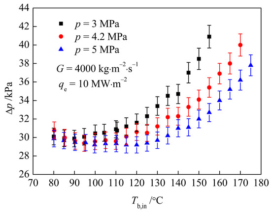 Figure 7 shows how the Δp with a TT changes with Tb,in under the working conditions of G = 4000 kg·m−2·s−1, qe = 10 MW·m−2, p = 3, 4.2, 5 MPa. It can be seen that when Tb,in ≤ 90 °C, the difference of Δp under different system pressures is small, and the three pressure drop curves all decrease slightly with the increase in Tb,in. When Tb,in increases further, the pressure drop curve of p = 3 MPa starts to rise, and the slope increases gradually with the increase in Tb,in. When Tb,in = 110 °C and Tb,in = 120 °C, the pressure drop curves of p = 4.2 MPa and p = 5 MPa also start to rise, and the slopes also increase gradually. At the same Tb,in, a higher p leads to a lower Δp. This is because when Tb,in ≤ 90 °C, the three pressure drop curves are all in the SP region, and the influence of system pressure on the SP pressure drop is small. Under the same qe and G, the lower the pressure, the earlier the SB region will be entered. And under the same Tb,in, the lower the pressure, the more intense the subcooled boiling, the more bubbles produced, and the larger the Δp.