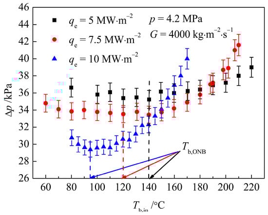 Figure 9 shows the variation curve of the Δp with a TT with Tb,in under the working condition of qe = 5, 7.5, 10 MW·m−2, p = 4.2 MPa, and G = 4000 kg·m−2·s−1. As can be observed from the figure, at a lower Tb,in, the three pressure drop curves slightly decrease with the increase in Tb,in, and the lower the qe, the larger the Δp. When Tb,in = 95 °C, the pressure drop curve under qe = 10 MW∙m−2 first starts to rise, and the slope increases with the increase in Tb,in, until it exceeds the Δp value under the other two qe successively. The pressure drop curves of qe = 7.5 MW∙m−2 and qe = 5 MW∙m−2 began to rise at Tb,in = 120 °C and Tb,in = 140 °C, respectively, and the slope also gradually increased. At Tb,in = 190 °C, the Δp at qe = 7.5 MW∙m−2 began to exceed the Δp at qe = 5 MW∙m−2. At a high Tb,in, the higher qe leads to a greater Δp. This is because at a low Tb,in, the three pressure drop curves are all located in the SP region. At this time, the smaller the qe, the greater the fluid viscosity near the wall, and the greater the Δp. The three pressure drop curves enter the subcooled boiling region at Tb,in = 95 °C, 120 °C, and 140 °C, respectively, according to the order of qe from large to small. When Tb,in > 180 °C, under the same Tb,in, the higher the qe, the more intense the subcooled boiling, the more bubbles produced, so the larger the Δp.