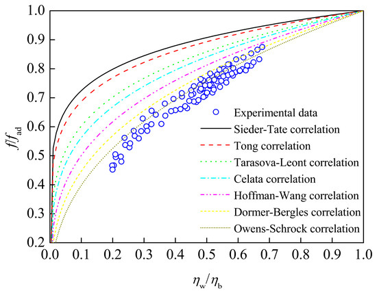 where (f/fad) is the ratio of pressure drop coefficient under the heated condition to that under adiabatic condition, (ρw/ρb) is the ratio of the fluid density under wall condition to that under bulk condition, and (ηw/ηb) is the ratio of fluid viscosity under wall condition to that under bulk condition, respectively. Among these correlations, the empirical constants m and n are different under different experimental conditions.