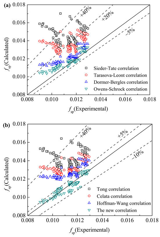 Figure 11a,b, respectively, show the relative error E between the predicted value and experimental value of the SP pressure drop coefficient by SP pressure drop correlations. It can be observed that in Figure 11a, the prediction effect of Owens-Schrock correlation and Dormer-Bergles correlation is reasonable. All the predicted values of Owens-Schrock correlation fall within the error range of −5% to 20%, and most of the predicted errors for the Dormer-Bergles correlation fall in the range of 0 to 20%. The predicted values of Tarasova-Leont correlation mostly fall in the error range of 0 to 40%, while the Sider-Tate correlation was less effective. In Figure 11b, the predicted errors of Tong association are relatively large, and most of the predicted values of Celata correlation and Hoffman-Wang correlation are in the error range of 0 to 40%, while the predicted performance of the new correlation represented by expression (16) is the best, most of the data points are in the error range of −5% to 10%, and the average error (AE) and root mean square error (RMSE) are 0.26% and 3.17%, respectively. It is worth noting that although the form of the new pressure drop correlation proposed in this paper is simple, the influences of high heat flux and high mass flux have been included in the calculation of the exponential term n. In the calculation of the viscosity ratio (ηw/ηb), the influence of system pressure and inlet fluid temperature is also included.