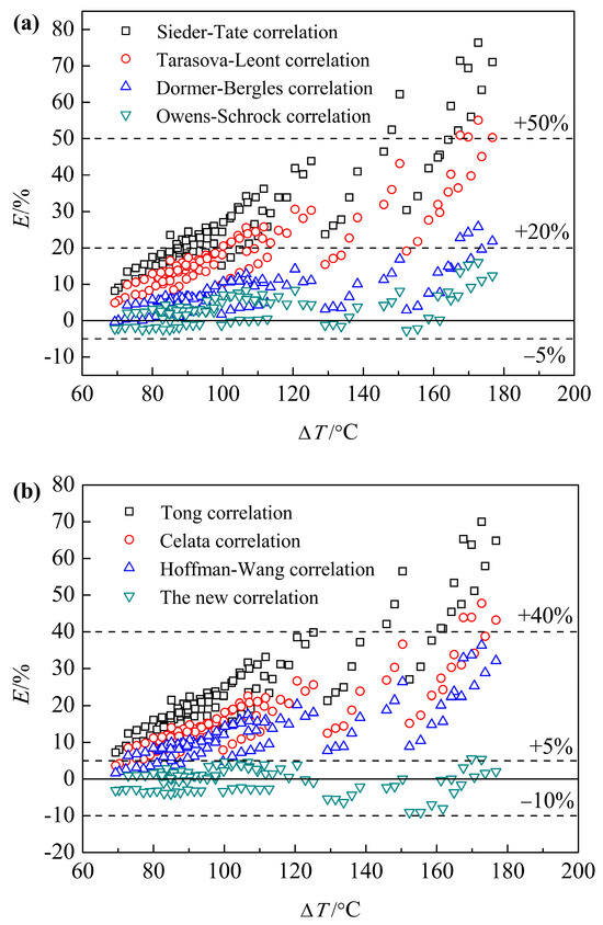 Figure 12a,b show the variation of prediction errors of each single-phase pressure drop correlation with the heat transfer temperature difference ΔT of the experimental section. The results show that the prediction errors of most correlations increase with the increasing ΔT, but the prediction errors of the new correlation proposed in this paper are relatively evenly distributed under different ΔT.