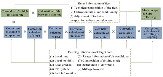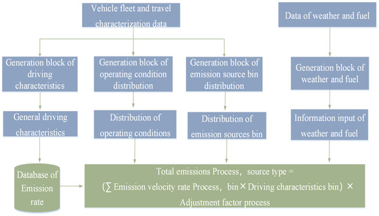 Derivative models based on VSP bin mainly include the MOVES model and the IVE model. The MOVES model is based on a large amount of local historical data in the U.S., which can not only be used to predict the energy consumption and emissions of each state except California, but can also be used to delineate the region or specify a period of time to calculate the energy consumption and emissions within the regional scope [28,29,30]. The main structure of the model is shown in Figure 3.