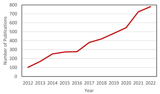 These published research articles were identified using the Web of Science database. The search criteria were based on the combination of logic operators (AND, OR) and some keywords inside titles and abstracts. In particular, the following key words were used: “state of charge” OR “state of health” AND “battery management system”. Figure 1 shows the increasing interest in these matters within the last decade. For a fair comparison, 2023 is not considered as being ongoing.