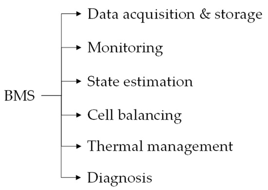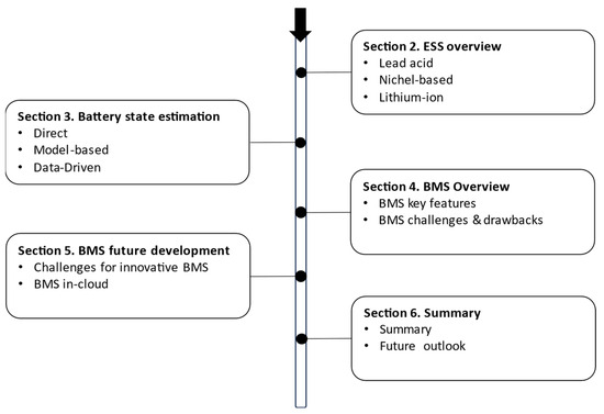 The remainder of this paper is organized as follows. Section 2 provides a brief overview of the main ESSs used in battery-powered vehicles. Section 3 describes the battery parameter estimation approaches mainly referring to SoC and SoH estimation methodologies. An overview of battery management systems is reported in Section 4, with a particular focus on BMS key features. Details on innovative BMS in-cloud applications are provided in Section 5. Finally, Section 6 reports a summary and a discussion on future development. Figure 2 shows an illustration of the present review paper structure.