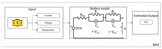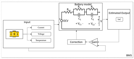 To address the direct methods’ limitations, in view of online battery parameter estimations, model-based techniques have been introduced. These methods connect through a battery model the measured battery signals (voltage, current and temperature) with the battery SoC. A high-fidelity battery model is required to capture the characteristics of the real-life battery and predict its dynamic behavior under varying operating conditions. In a BMS algorithm, the model uses signals as inputs to calculate the SoC and other battery states. The schematic battery state estimation diagram process is depicted in Figure 4.