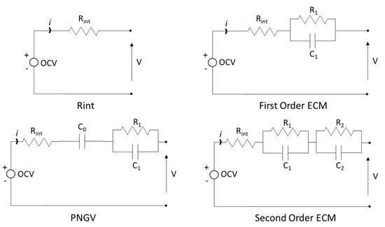The ECM model is composed of an open-circuit voltage source connected with a combination of electric elements such as resistors, and capacitors to describe the battery behavior under a certain load [55]. The simplest ECM, also known as the Rint model, is an ideal OCV voltage source connected in series with an internal ohmic resistance, both functions of SoC, SoH, and temperature [56]. The internal resistance Rint value represents the voltage drop in the cell when it supplies/absorbs current under a certain load. This parameter defines battery performance and its SoH [57]. Improved versions of this basic model are obtained by adding different resistor–capacitor (RC) branches to capture different time constants inherent in the battery system. In the Thevenin ECM or first-order ECM, a RC group is added to represent the voltage relaxation dynamics and describe the transient response during charging/discharging phases [58]. A further improvement in the first-order ECM consists of adding a capacitor in series to the internal ohmic resistance to describe the OCV changing with the SoC value. This battery model is called Partnership for a New Generation of Vehicles (PNGV) [59]. The PNGV model is an accurate nonlinear equivalent circuit model for transient response process simulation. It can be used with high currents and in charging/discharging severe conditions [41]. Nevertheless, the relatively high complexity leads to an increase in computational effort and consequently lower real-time performance. The so-called second-order ECM is composed of two RC branches to take into account the slow and fast transient response caused by charge transfer and ion diffusion phenomena [60]. The second-order ECM is widely used for online battery SoC estimation since it is computationally efficient and accurate. The increase in RC branches improves the model accuracy, however the computational effort increases as well [61]. Figure 5 illustrates the typical representations of the aforementioned models.