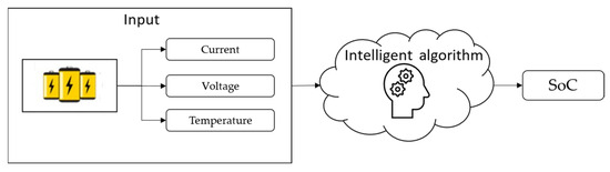 Data-driven (DD) approaches consider the battery as a black-box model. In this case, the battery is presumed to be an unknown system and the internal dynamics have been learned through a vast quantity of data [50]. Specifically, the model considers online measurable parameters such as battery current, voltage and temperature as inputs and battery state of charge (SoC) as the output. The model utilizes intelligent algorithms to train on input and output data, establishing the relationship between them [41]. Figure 7 schematically depicts the process. The main DD approaches exploited for SoC estimation, as shown in Figure 3, include fuzzy logic (FL), neural network (NN), genetic algorithm (GA), and particle swarm optimization (PSO). These approaches, being free of capturing any physico-chemical mechanisms, have potential advantages such as flexibility and strong adaptability and being highly nonlinearly matching [101]. However, the main disadvantage of these algorithms is their sensitivity to the quality of the training dataset and that they may easily encounter overfitting or underfitting problems. In addition, the on-board implementation of DD methods for online SoC estimation is currently challenging.
