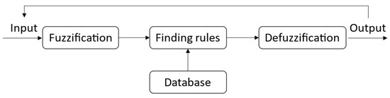 The FL method provides a powerful means of modeling nonlinear and complex systems [47]. This methodology is regarded as a problem-solving approach that simplifies all input data, characterized by noise, vagueness, ambiguity and imprecision, through the application of objective rules to determine the real value of the input [102]. In addition, FL does not require a precise mathematical model of the system, as it only uses the input data and identifies the parameters using the fuzzy rule base. Fuzzy methods are robust and tolerant to imprecise measurements and component variations with rules that are easily tunable. The basic idea of a fuzzy algorithm is to formulate human knowledge and reasoning as a collection of “If–Then–Else” rules tractable by a computer [103]. The FL process can be divided into the following steps [104]: First, the inputs are fuzzified, or otherwise are converted into fuzzy language and grouped into membership functions. In the rule step, the relationship between input and output variables is described and a database defines the membership functions for the input and output variables. Finally, the fuzzy output value is defuzzied and translated into a real analogue value output. Figure 8 shows the basic steps of the FL approach.
