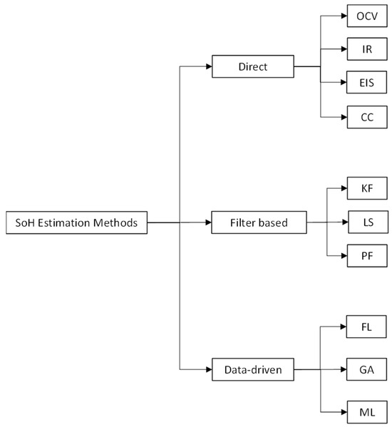 OCV is a conventional approach to evaluate the SoC by measuring the circuit voltage in an open circuit state and using SoC–OCV relationships. The SoC–OCV relationships are not the same for different batteries, they are influenced by battery capacity and electrode materials. For example, a lead-acid battery has a linear SoC and OCV relationship [35]. Conversely, the LFP battery shows a quasi-flat SoC–OCV relationship region. Within this region, OCV variation is very small compared to SoC variation. Thus, misleading estimation of SoC might occur [36] Although the SoC–OCV curve of lithium–ion batteries is relatively stable, it will change according to the charging/discharging rate, battery temperature, cell variation, and cycle life of the battery [37]. To consider the aging mechanism, several adjustments to the OCV modeling curve are necessary, such as incremental capacity or differential voltage analysis [38]. While this method demonstrates simplicity and high accuracy, it necessitates an extended resting period to attain the battery’s equilibrium state, a duration influenced by environmental conditions. Additionally, precise voltage measurements are essential due to the battery’s hysteresis characteristics.