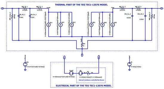 The first models of the thermoelectric modules that were implemented into electronic circuits’ simulators were working in cooling mode. In [53], an analysis of a developed PSPICE-compatible equivalent circuit of a thermoelectric cooler was demonstrated, whereas in [54,55], an electrothermal macromodel of an active heat sink based on TEM for cooling process simulation was described. In [56], a modified electrothermal model of TEMs was demonstrated, with temperature-dependent material properties taken into consideration. The electrothermal models of TEMs working as thermogenerators differ from coolers in that an extra circuit has to be added that models a voltage source resulting from the Seebeck effect [57,58,59].