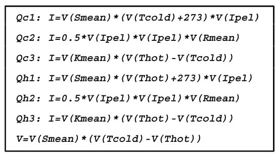 In the thermal part of the equivalent model shown in Figure 5, the three parallel current sources Qcn on the left side of the circuit and the three Qhn on the right mimic heat power sources on the cold and hot sides of the TEG, respectively. They originate directly from Equations (4) and (5), consisting of three components reflecting the Peltier effect (Qh1 and Qc1), Joule heat generation (Qh2 and Qc2), and heat conduction (Qh3 and Qc3). The heat power sources Qcn and Qhn are controlled by auxiliary voltage sources reflecting the actual values of R, S, and K calculated continuously at mean temperature Tmean across the module (11). The detailed description of Qcn and Qhn, as well as the Seebeck voltage VS modeled in the LTspice, are shown in Figure 6. In particular, for Qc1, a current source I is controlled by three voltage sources. The I is mimicking the heat power source on the cold side, which is responsible for the Peltier effect. It is modeled according to Equation (4) as a product of the mean value of Seebeck coefficient S expressed by a voltage V (Smean) having the value of Smean, next the absolute temperature at the cold side expressed by a voltage V(Tcold) + 273, and finally the voltage V(Ipel) having the value of Peltier current flowing through the TEG. On both sides of the connected in parallel heat power sources Qcn and Qhn, there are also in the equivalent circuit the lumped thermal capacitors, and as well as the thermal resistors, and is responsible for mimicking heat conduction and accumulation.