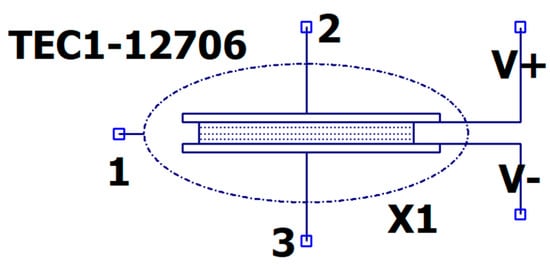 For the simplicity of the simulation exercise, the complex electrothermal model is hidden from the enduser with a hierarchical structure in the LTspice tool. The final component that can be used in prototype circuits and systems is represented by a five-terminal symbol (Figure 7). Terminals 1, 2, and 3 correspond to the ambient, hot, and cold side temperatures, respectively, whereas V+ and V− correspond to the output voltage.