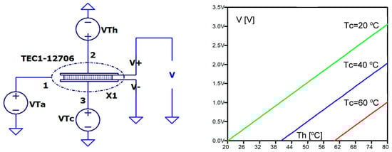 The voltage sources VTa, VTc, and VTh represent the ambient Ta, cold Tc side, and hot Th side temperatures of the TEG, respectively. The simulations were performed with various temperature gradient values, with Tc specified as a parameter and Th declared as a variable. The obtained results enable the estimation of the highest voltage ratings in the absence of loads. They can be highly beneficial when designing DC-DC boost regulators necessary to increase the voltage and fulfill the requirements of electronic circuits, such as sensor network nodes. As expected, the plots shown in Figure 9 prove that the Seebeck voltage is proportional to the temperature gradient across the TEG and that the module TEC1-12706 can provide at least V = 510 mV at ∆T = 10 °C and as much as V = 3.06 V at ∆T = 60 °C.