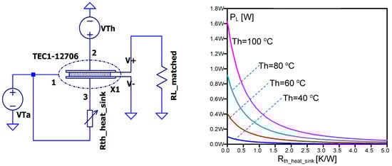 Figure 12 demonstrates the output power PL in function of the thermal resistance Rth_heat_sink of a heat sink at various temperature differences between the TEG sides; the temperature of the cold side is constant and set to Tc = 20 °C, whereas the hot side temperature changes in 20 °C increments. The matched load resistance was set to 2.5 Ω, as it follows the results presented in Figure 11. The plots show a strong dependence of the output power PL on the thermal resistance of the heat sink, which plays an essential role in the energy conversion process and significantly contributes to the overall efficiency of the TEG, but on the other hand, it is very cumbersome as its dimensions are bulky, and thus it often takes up much more space than the TEM and the WSN node combined.