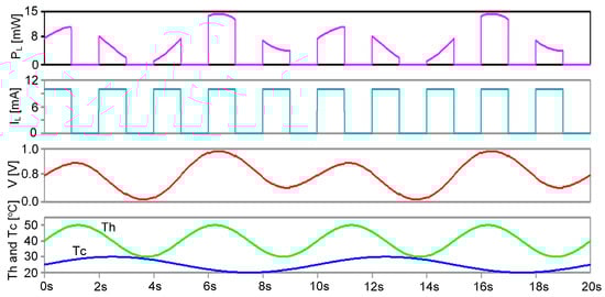 The proposed model is suitable to perform simulation experiments not only in steady states but also under varied environmental conditions. Figure 13 shows an example scenario where changing external conditions are expressed by sine temperature waveforms at hot and cold sides and the operational stress resulting from the electrical current periodically taken from the TEG to supply an electronic circuit, which is reflected in a square-like wave. The hot temperature Th (green) is varying with a frequency of 200 mHz, whereas the cold temperature Tc (blue) has a 100 mHz rate. The output voltage V (red) results directly from the Seebeck voltage, which is proportional to the temperature difference Th-Tc. In periods when the current IL is taken, the output voltage V is lowered by a voltage drop at the internal TEG resistance. The power PL delivered from the TEG is calculated as the product of the output voltage V and the load current IL.