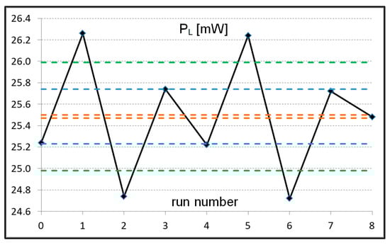 The sensitivity of the model performance to key parameters was evaluated in relation to the generated power PL under the matched resistive load RL = 2.5 Ω and a temperature gradient of 10 °C. The worst-case conditions analysis instead of the distribution approach was used in calculations, and maximum deviations of 1% from the nominal value of each material parameter were assumed, namely the Seebeck coefficient S, electrical resistance R, and thermal conductance K. To assess the impact of material tolerances on the generated power, simulation experiments consisting of nine runs (numbered from 0 to 8) were carried out to cover all the combinations of maximum and minimum values of the three parameters plus the nominal one in the last run.