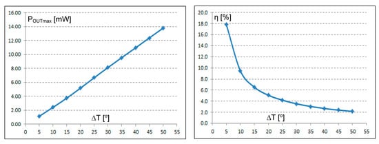 Maximum output power POUTmax (left) and conversion efficiency coefficient η (right) against temperature difference ∆T across TEG, obtained for a combined TEG-LTC3108 circuit.