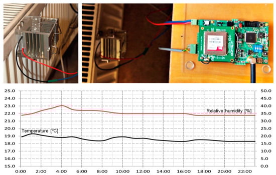 The model of the TEG was successfully used in developing a battery-less microelectronic system for remote sensing (Figure 17). The completely autonomous wireless sensor node working in a wireless network, powered by a thermoelectric converter and harvesting heat from a central heating system, were able to take and collect data on humidity and temperature in 60 min intervals and transmit them every 36 h. The thermoelectric module was attached to a heat sink (top-left in Figure 17) from one side and to an aluminum block with built-in neodymium magnets, next to the surface of a radiator, from the other.