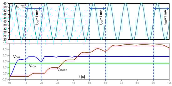 Figure 15 shows the electrothermal circuit being tested and the plot of the output voltage VOUT from the LTC3108 when the temperature gradient across the TEG is 20 °C. As the TEG starts the conversion of heat energy into electrical energy and the integrated circuit is boosting the voltage, before the output voltage is kept constant and regulated at 3.3 V, it increases linearly, which means that the output capacitor C5 = 100 µF is charged by a constant current IOUT.