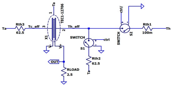 Table 1 presents the extracted values of the components for the equivalent circuit model of the TEC1-12706 working as a thermoelectric converter. The coefficients ‘a’ and ‘b’ express the linear approximation of the temperature dependence of the parameters R, S, and K according to the linear function y = ax + b. The complete equivalent circuit of the thermoelectric converter based on TEC1-12706 is shown in Figure 5.