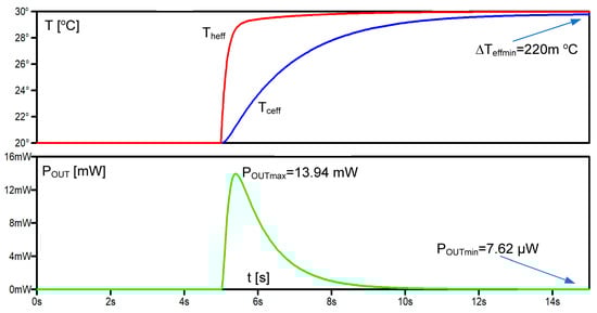 The graphs presented in Figure 8, Figure 9, Figure 10 and Figure 11 give very useful data about the static boundary operating conditions that the TEG can work in, as well as the available voltage and power it can deliver to supply electronic systems or WSN nodes. However, the electrothermal model of the TEG fully demonstrates its capabilities and usefulness in simulations of dynamic processes in the time domain. Two practical, real-life scenarios are discussed below.