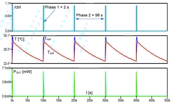 In Figure 22, the results of the simulations of pulse mode TEG operation are shown. The “/ctrl” signal controls the switches S1 and S2 and the moments in time when the TEM is either attached to the heat source (/ctrl is high) or is detached (/ctrl is low). From the effective temperature plots Tceff and Theff, we can see that the thermal time constant at Phase 1 (when the TEG is fed from the heat source) is much lower than in Phase 2 (when the heat accumulated in the TEG is slowly dissipated to the ambient by large convection thermal resistances Rth2 and Rth3). Consequently, in the pulse mode operation, apart from the first period when temperatures at both TEM sides start rising from ambient, in the following periods the temperatures are higher and the peaks of the generated output power are lower (6.76 mW) than at the beginning of the operation (13.94 mW) (Figure 21). However, the average power in the pulse mode operation (POUTavg = 85.23 µW) is much higher than in the continuous mode (POUTmin = 7.62 µW) when the thermalization process takes place at a high thermal resistance between the TEG cold side and ambient.