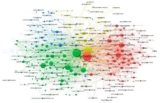 As Figure 2 shows, overall, there were 293 items grouped in five clusters. The most often occurring keywords were waste management, construction industry, recycled aggregates, carbon footprint, waste disposal, compressive strength, life cycle assessment, decision making, reuse, and recycling.