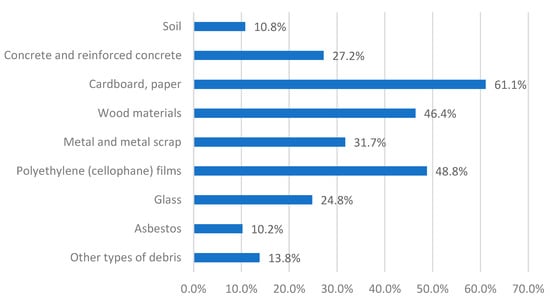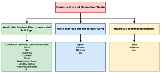 Construction and demolition waste is usually divided into three groups—waste after the demolition or removal of buildings, waste after road and street repair projects, and hazardous construction materials (Figure 3).